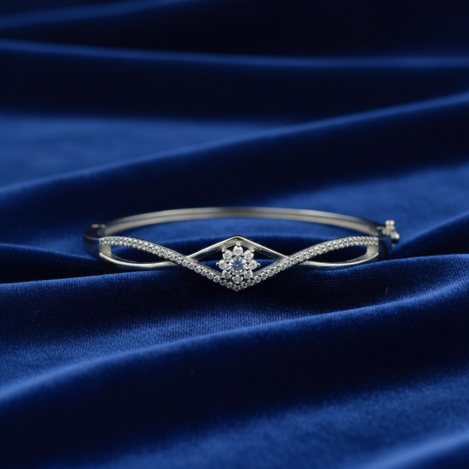 Zircon Filled Silver Dual Blooming Flower Ring, Adjustable